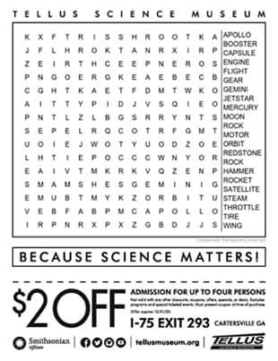 Georgia: Tellus Science Museum $2 off admission printable coupon Get $2 off 1 adult, child, or senior citizen general admission ticket Tellus Science Museum in Cartersville, Georgia - science and fun Tellus Science Museum is a World-class...